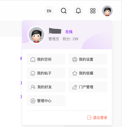 鼠标放置头像上悬浮:我的空间、我的设置、我的帖子、我的收藏、我的好友