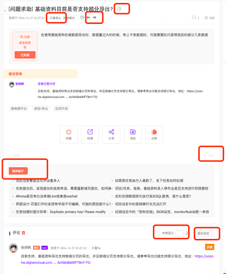 点击帖子标题,进入帖子内容页,在此可以查看主题内容和回复内容,用户可以利用页面提供的内容排序功能筛选想要查看的内容。同时为方便用户深入了解相关内容,页面还可以根据帖子标签聚合相关帖子,显示在主题内容下方。页面还提供了发帖人与回复人名片的显示,便于了解用户的信息。