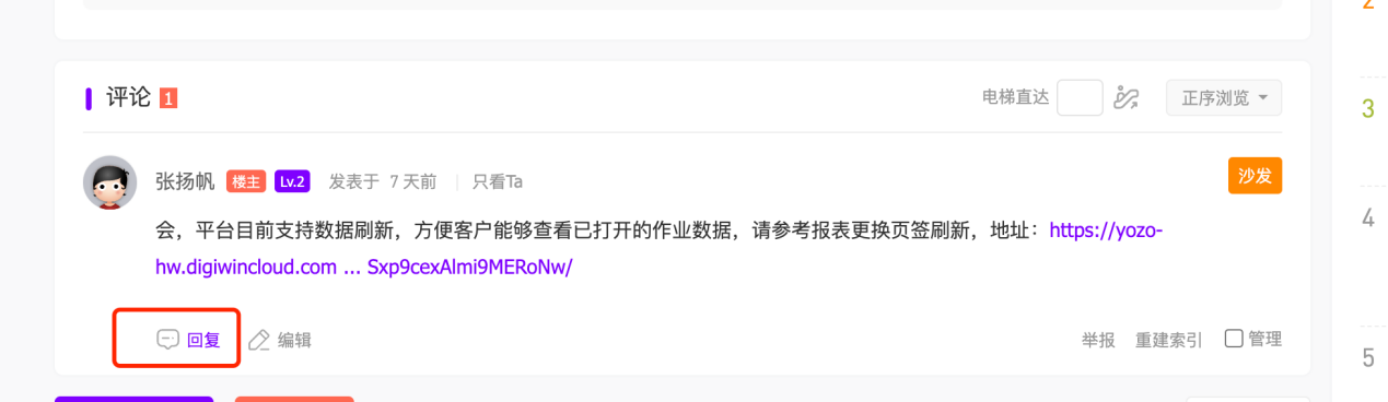 楼层回复:用户也可以点击楼层中的回复按钮对选定楼层进行回复,回复后,被回复的楼层用户将会收到帖子被回复的提醒