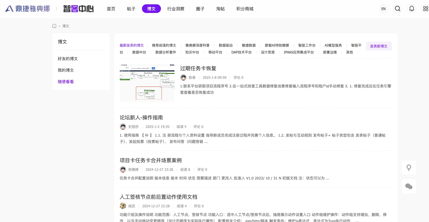 点击导航栏博文,可查看所有博文列表,其中含最新发表的博文、推荐阅读的博文