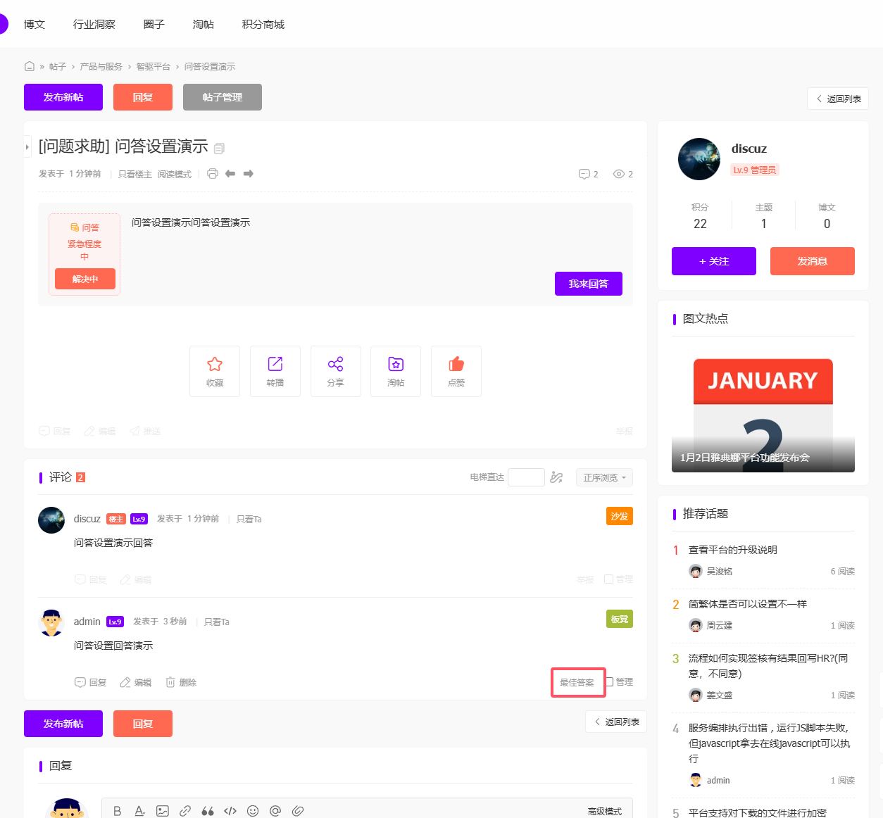 附加选项:可设置接收回复通知;管理员可以直接置顶|精华设置