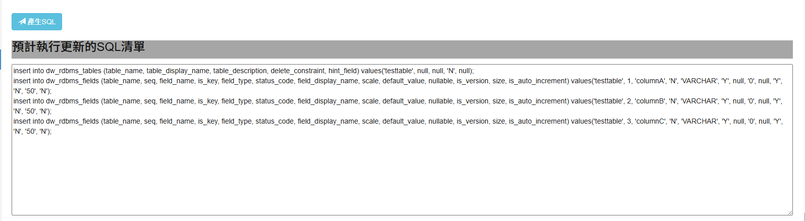 STEP3.在页面最下方, 按下[产生SQL], 则可在下框看到产生的SQL, 将之复制到您的SQL Client执行即可