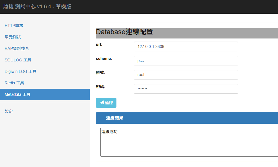 STEP1.进入MataData工具, 填写数据库连线资讯后, 按[连线], 当下方出现连线成功即表示已连线
